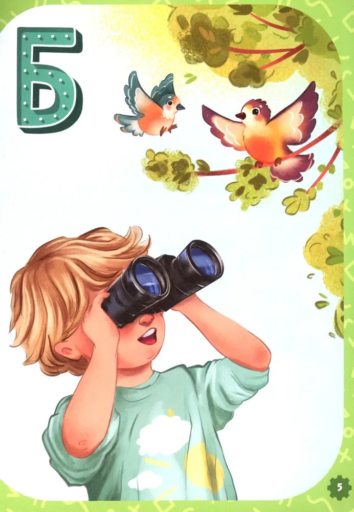 Каждая буква сопровождается стихотворением, которое раскрывает тему и смысл, а также игровыми элементами, такими как лабиринты и задания на поиск правильной буквы. Например, на страницах с буквой "Б" ребенок познакомится с биноклем и научится рассматривать птиц, а стихотворение про "Гонку" дополнит развитие речи и воображения.