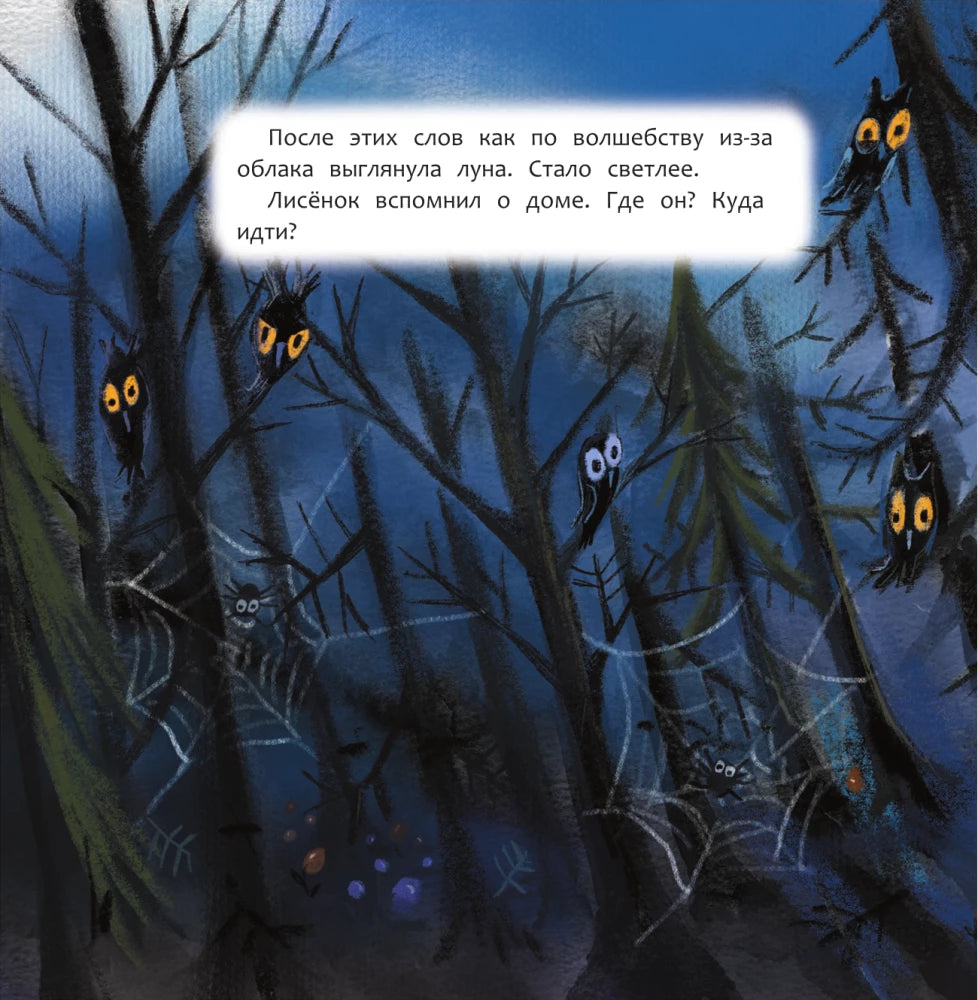 Словно по волшебству, из-за облаков выглядывает луна и освещает дорогу. Лисёнок вспоминает свой дом и отправляется на поиск, осторожно и несмело пробираясь через лес, наполненный загадочными ночными обитателями.