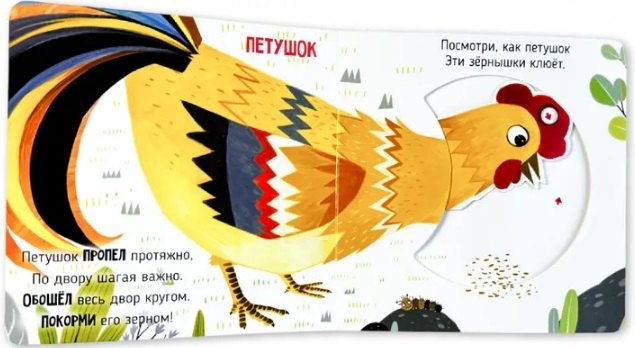 Плотный картонный переплёт и удобный формат делают её идеальной для маленьких детских рук. Ребёнок сможет узнать, как петушок клюёт зернышки, кто прячется в сарае и что издаёт корова - узнавание знакомых образов способствует развитию речи и внимательности.
