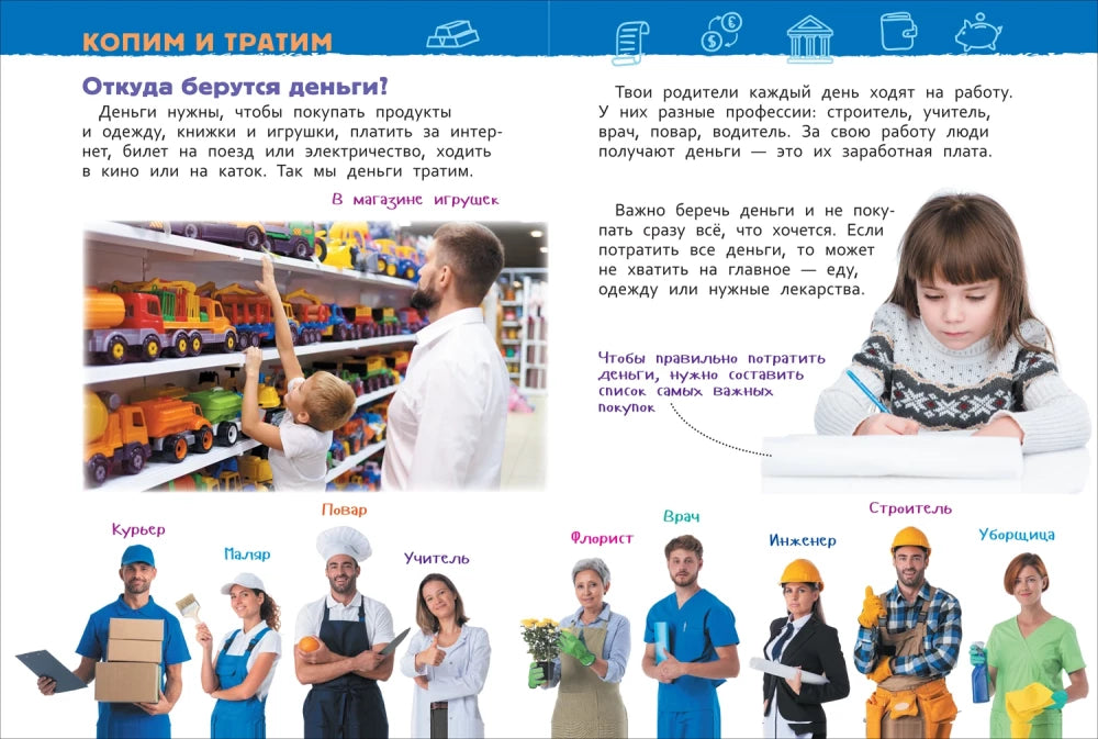 Издание содержит красочные иллюстрации, показывающие разные профессии взрослых, за которые люди получают заработную плату: строители, врачи, учителя, курьеры и другие. Это помогает детям понять связь между трудом и деньгами.
