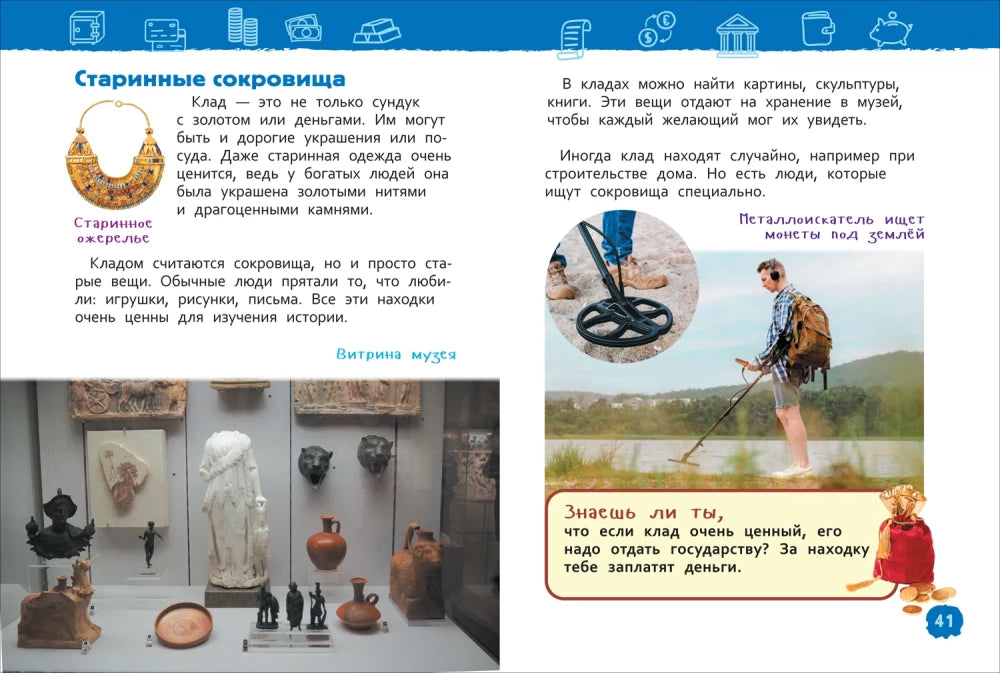 Кроме того, в книге рассказывается о старинных кладах, драгоценных сокровищах и научных находках, которые хранятся в музеях. Для малышей доступно объяснено, почему иногда даже обычные вещи, скрытые в земле или в старых сундуках, могут иметь большую историческую и материальную ценность.