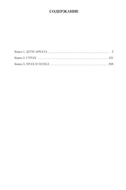 Произведение состоит из трех книг: "Дети Арбата", "Страх" и "Прах и пепел", что позволяет глубоко и всесторонне раскрыть тему исторических событий и их влияния на жизнь простых людей. Всего 1280 страниц насыщенного текста расскажут о сильных переживаниях, мужестве и страхах тех, кто жил в эпоху, ставшую символом трагедии и испытаний.