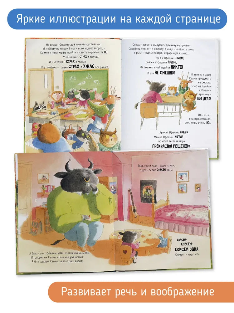 В центре повествования - папа Офелии, огромный бык, который внешне кажется страшным и грозным, но на самом деле очень добрый и заботливый. История учит не судить по внешнему виду и не бояться того, что кажется непривычным или пугающим. Стихи легко запоминаются и развивают речь ребенка.