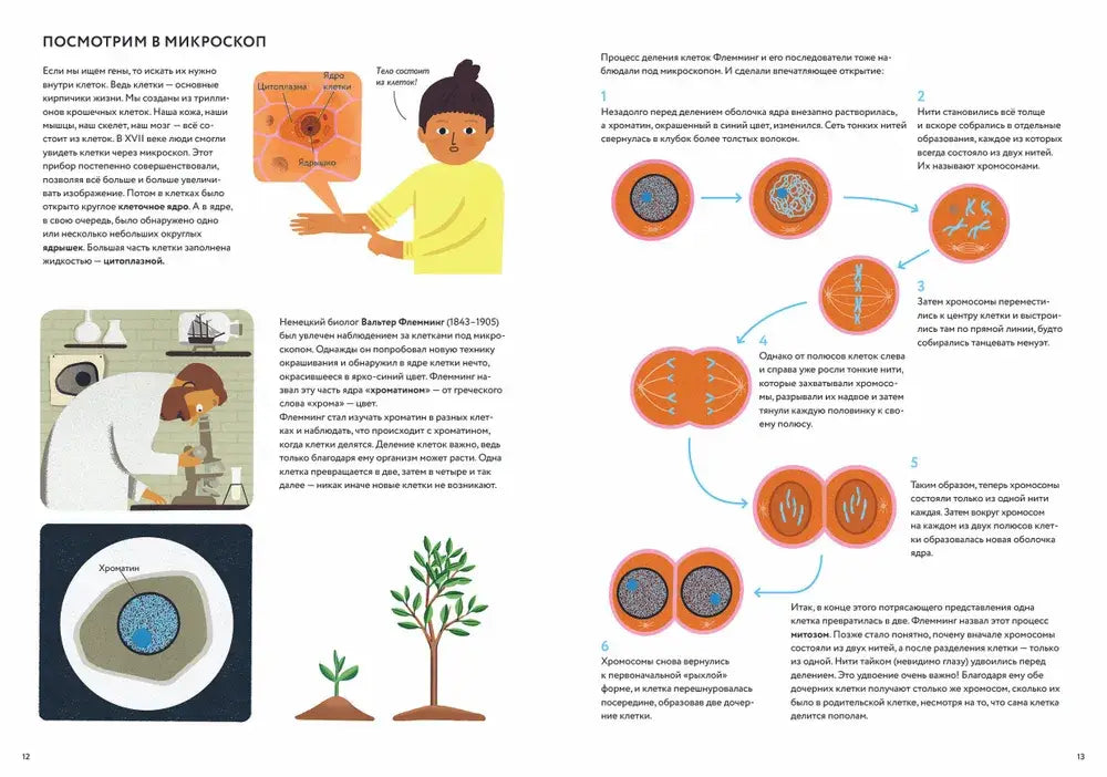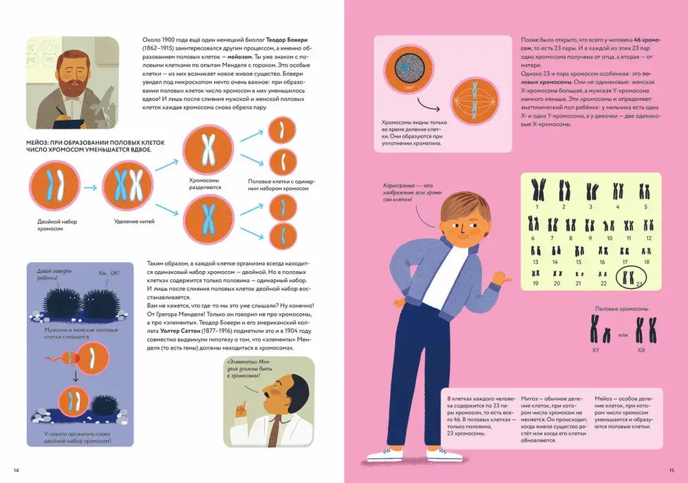 Особое внимание уделено открытиям немецких биологов Теодора Бовери и Вальтера Флемминга, которые расширили представления о строении клеток и хромосом. Книга помогает понять, как именно происходит передача наследственной информации, и почему у человека 46 хромосом, включая пары половых хромосом, определяющих пол ребёнка.