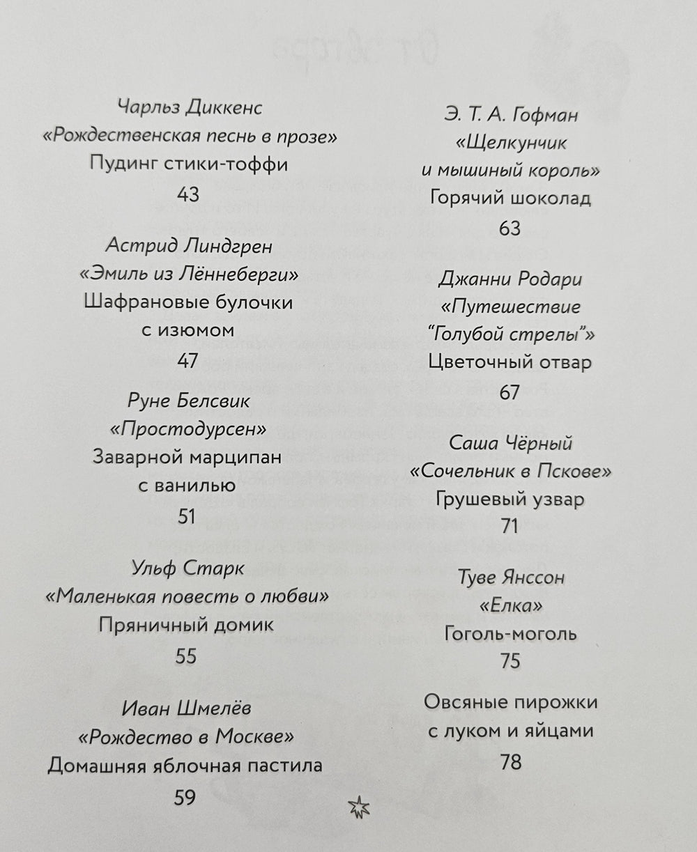 В сборнике представлены разнообразные блюда, вдохновленные произведениями таких авторов, как Диккенс, Гофман, Гоголь, Шмелёв и других. Вы сможете приготовить рождественского гуся, шоколадные лакомства, пряничные домики, шафрановые булочки с изюмом и многое другое, узнавая больше о зимних и праздничных традициях разных стран.