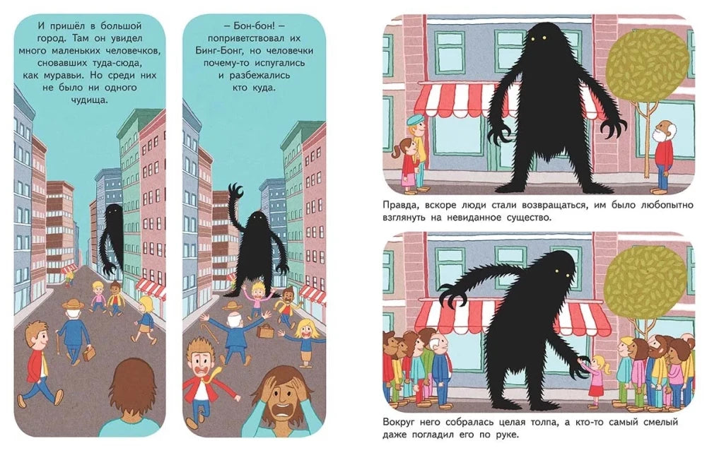 Однажды Бинг-Бонг решает посетить большой город, где встречает много маленьких человечков. Вначале они пугаются его вида, но потом люди начинают проявлять любопытство и дружелюбие к этому необычному герою. История полна теплоты и рассказывает детям о принятии и дружбе, учит быть добрыми и открытыми к новому.