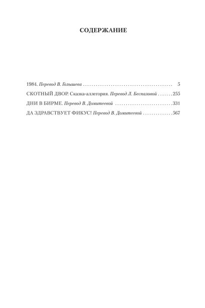 В этом издании представлены знаменитые произведения Джорджа Оруэлла – романы «1984» и «Скотный двор», а также повесть «Дни в Бирме» и рассказ «Да здравствует Фикус!». Все тексты переведены известными переводчиками и объединены в одном томе объемом 768 страниц.