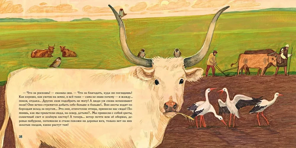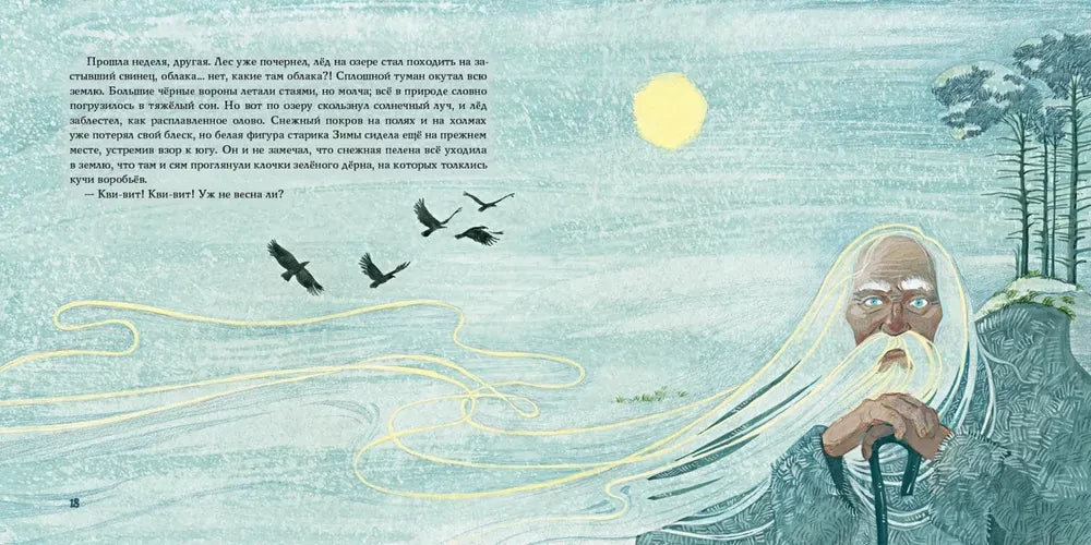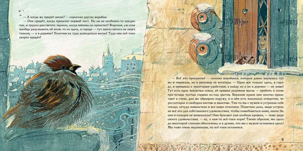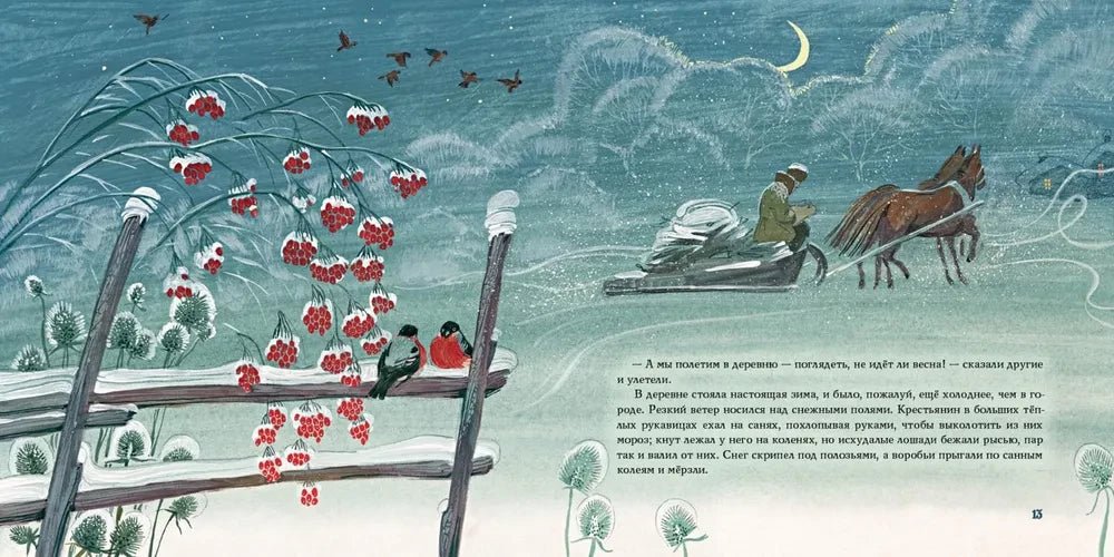 В книге поднимается тема смены времен года, природы, появления весны и особенностей жизни птиц и животных. На страницах показана теплая и познавательная история о том, как все живое в природе переживает смену сезонов, о первенстве и особенном моменте прихода весны в деревню. Иллюстрации передают атмосферу тихого зимнего вечера, пробуждающегося к жизни лета и смены осени.