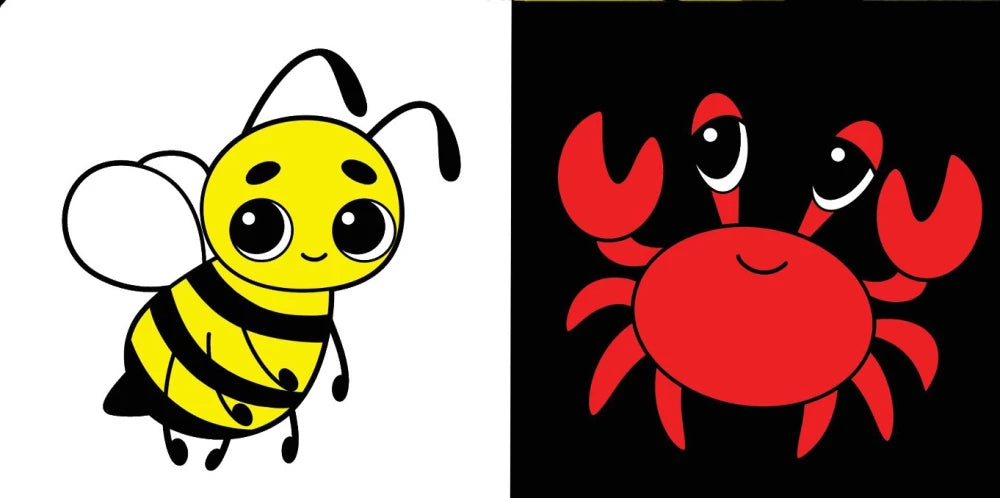 Книга выполнена в формате 150х150х5 мм с картонными страницами, что делает её удобной и безопасной для маленьких пальчиков. На страницах изображены простые, но запоминающиеся животные и насекомые с большими глазами, которые привлекают внимание крохи и способствуют развитию зрительных навыков.