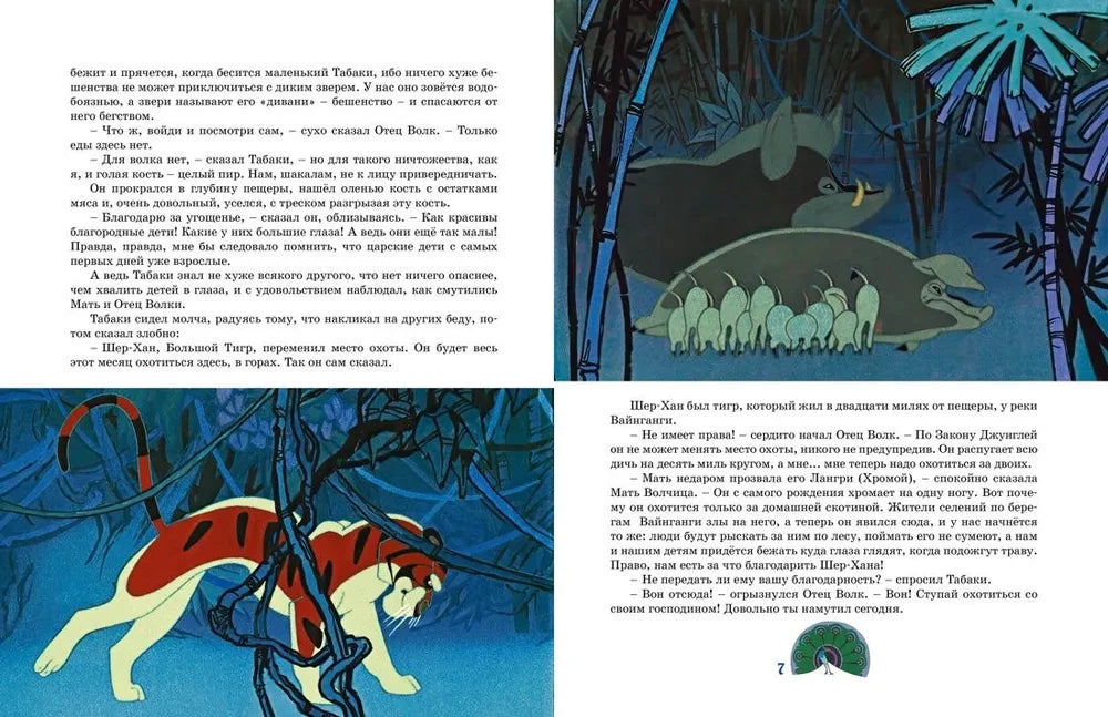 История Маугли наполнена важными уроками дружбы, отваги и взаимопомощи. Читатель сопереживает герою, который учится у зверей законам джунглей, узнает древние слова Змеиного Народа, преодолевает опасности и находит своё место в мире. Сюжет динамичен и насыщен событиями - здесь есть и взаимодействие с медведем Балу, и борьба с тигром Шер-Ханом, и образ волка Отца Волка.