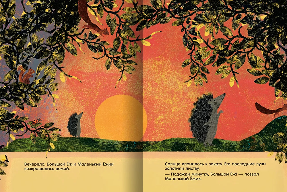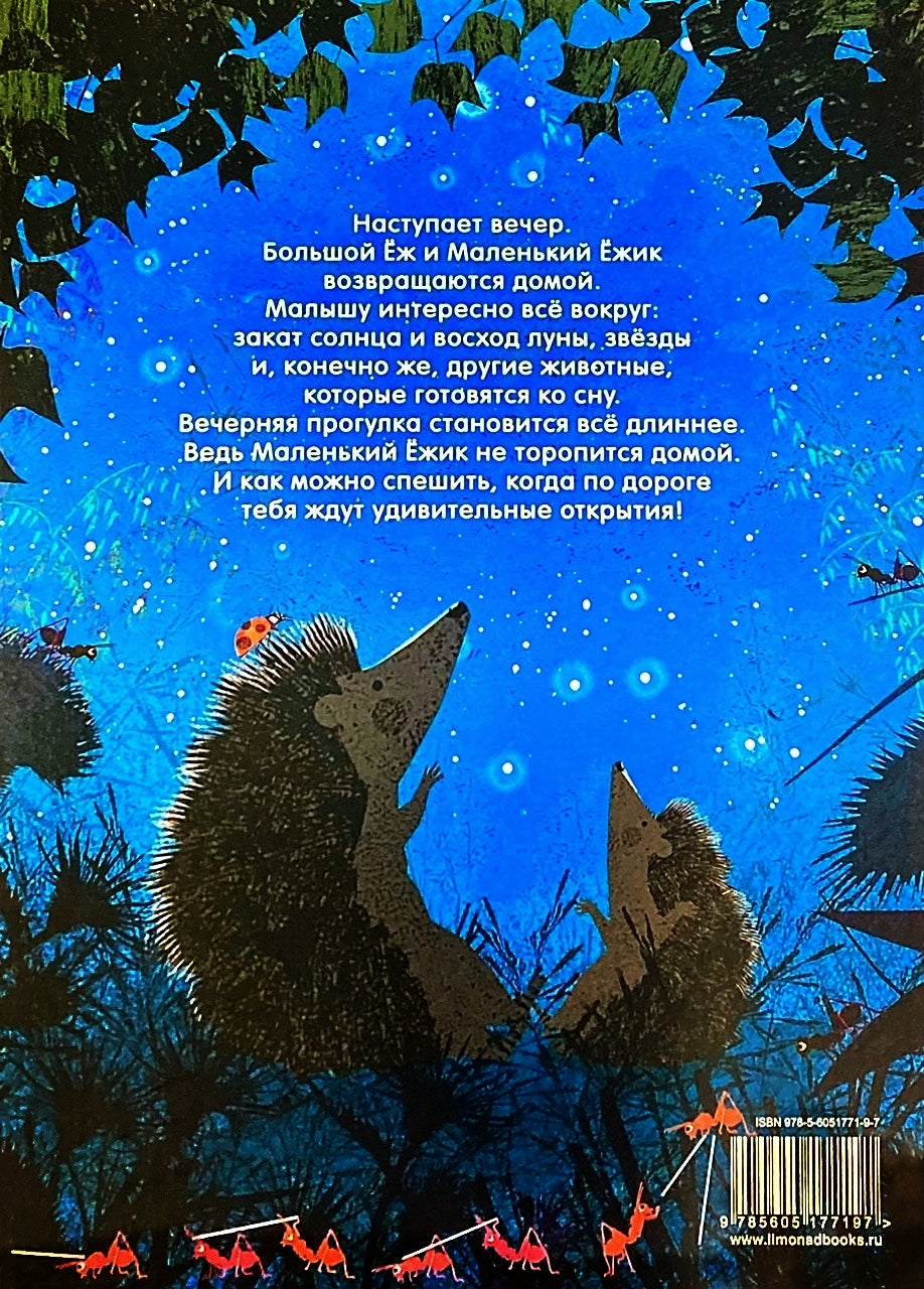 Эта добрая и познавательная история о вечере и любознательности маленького героя учит ценить окружающий мир, замедляться и замечать детали. Яркие иллюстрации погружают в атмосферу лесного заката, а совместные приключения Большого и Маленького Ёжиков вдохновят малышей и их родителей на неспешные прогулки и познание прекрасного вокруг.