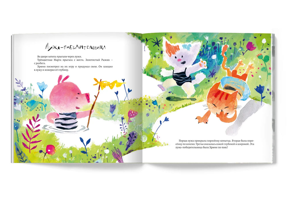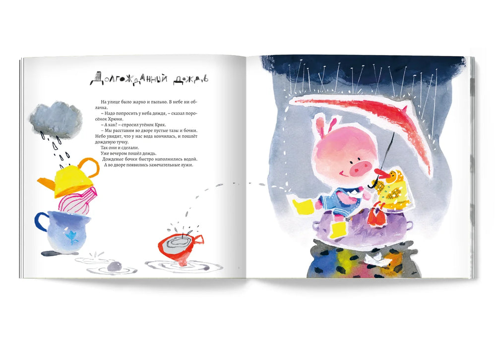 В этих ярких сюжетах вы найдете трогательные моменты, например, когда герои ждут давно желанный дождь и радуются замечательным лужам после него, а также узнаете, как весело играть и измерять глубину луж. Добро и веселье сопровождают каждую страницу с живыми персонажами в атмосфере тепла и дружбы.