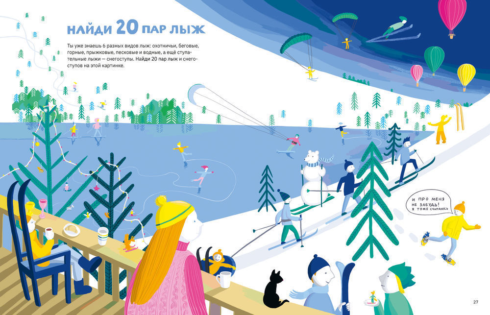 Здесь есть занимательные задания, например, поиск пары лыж на красочной иллюстрированной картинке. В книге подробно рассказывается, как сделать лыжи и лыжников из подручных материалов, таких как палочки от мороженого и пластилин, что развивает творческие способности и мелкую моторику.
