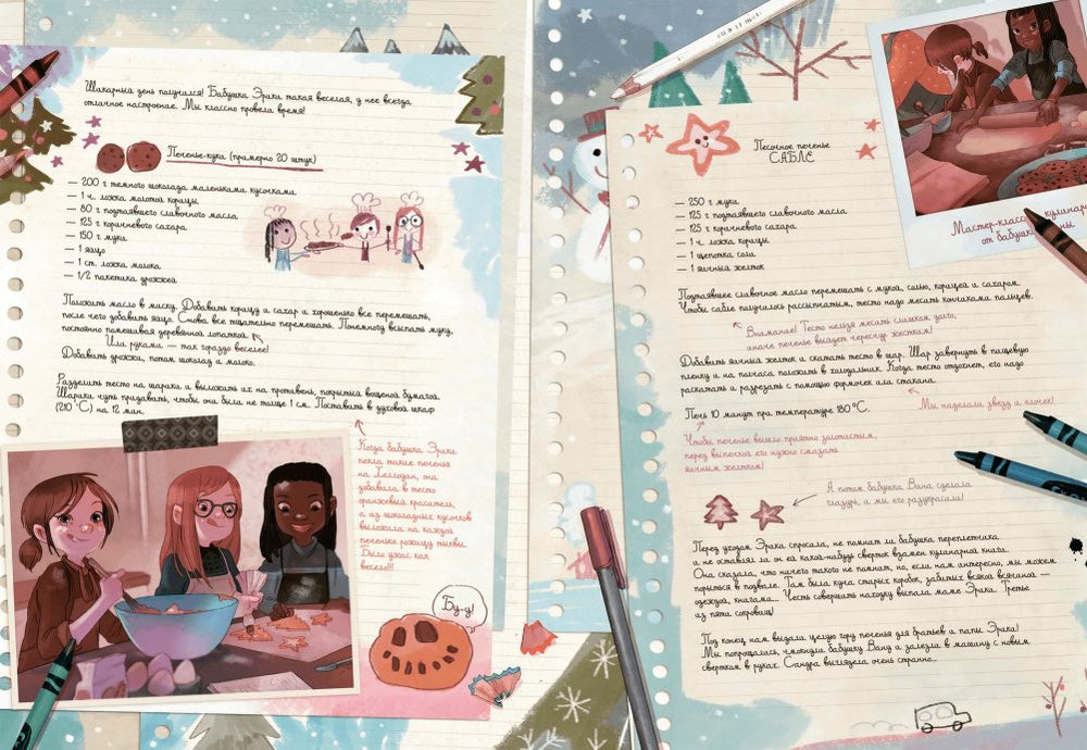 Повествование ведется через комиксы и дневники, что делает чтение живым и увлекательным. В книге гармонично сочетаются яркие иллюстрации и насыщенный сюжет, что позволяет легко погрузиться в мир героев и почувствовать дух наступающего праздника.