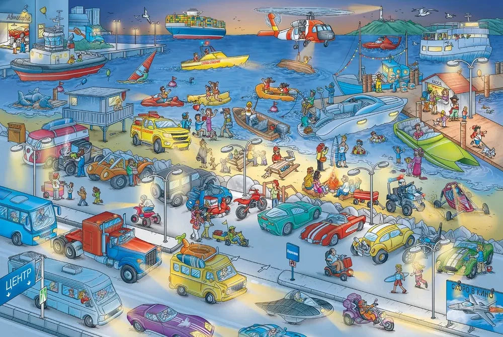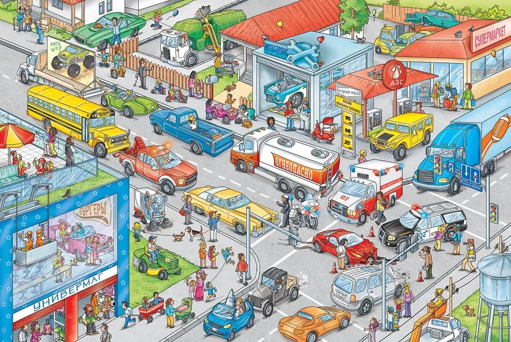 Захватывающий визуальный рассказ научит мальчиков и девочек разного возраста распознавать типы машин, их назначение и взаимодействие в городе, на стройке, на море и в других местах.
