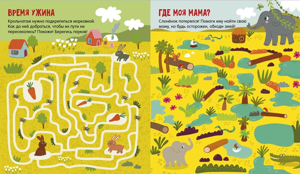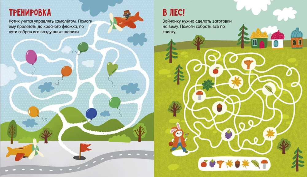 Ребёнок будет с радостью помогать милым персонажам проходить лабиринты, решая задачи, в которых нужно найти путь от одного пункта до другого. Например, помочь котику управлять самолётом, собирая воздушные шары, или помочь зайчонку сделать заготовки на зиму, собирая всё необходимое по списку.