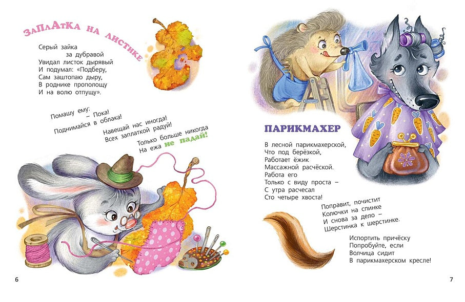Сборник состоит из 24 страниц, наполненных красочными иллюстрациями Екатерины Варжунтович, которые оживляют каждую сказку и делают чтение по-настоящему увлекательным. В доступной и легкой форме малыш познакомится с разными персонажами: медвежатами, зайчиками, ежиками и другими жителями большого леса, которые переживают веселые и поучительные истории.