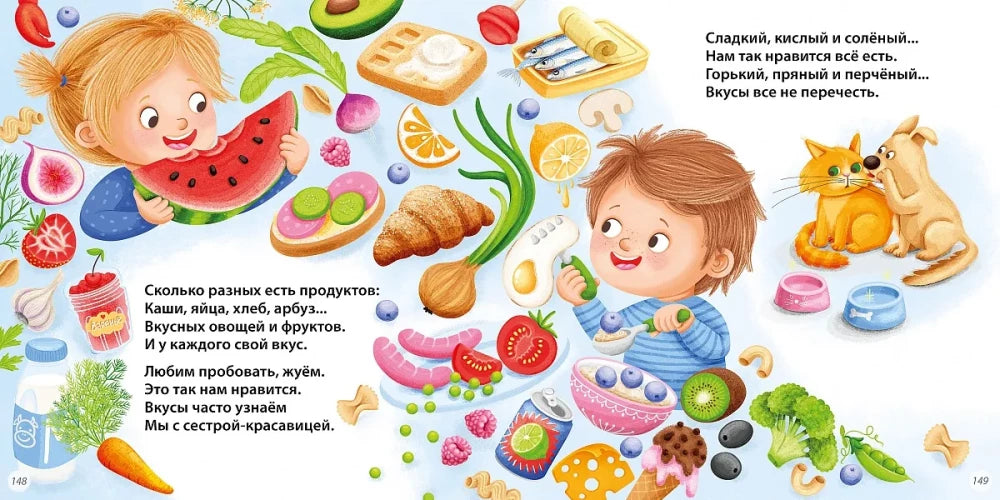 В книге собраны веселые истории о том, как дети пробуют сладкое, кислое, солёное и горькое, вместе со своей сестрой и домашними питомцами открывая мир еды с радостью и любопытством. Захватывающие считалочки с обитателями леса и весёлые персонажи сделают процесс обучения интересным и увлекательным.