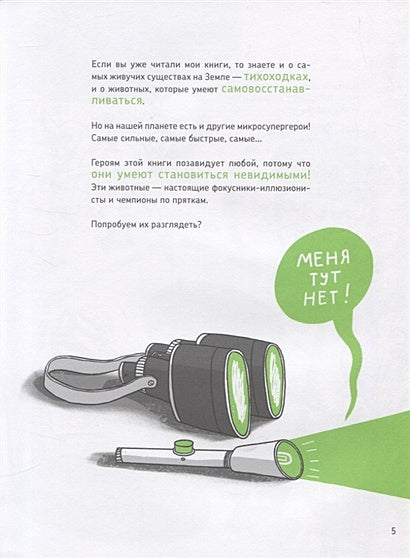 Если вы уже знакомы с моими книгами о тихоходках и животных, которые умеют самовосстанавливаться, то эта новая книга подарит вам знакомство с другими микросупергероями. На нашей планете есть существа, самые сильные, самые быстрые и самые невидимые. Герои этой книги обладают уникальной способностью становиться невидимыми - настоящими мастерами маскировки и чемпионами по пряткам. Эти животные - настоящие фокусники и иллюзионисты природы.