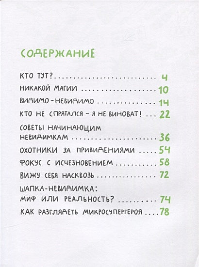 Вас ждут советы начинающим невидимкам, рассказы об охотниках за привидениями, фокусы с исчезновением и даже шапка-невидимка - миф или реальность? Эта книга раскрывает все тайны микросупергероев и поможет взглянуть на мир под новым углом.