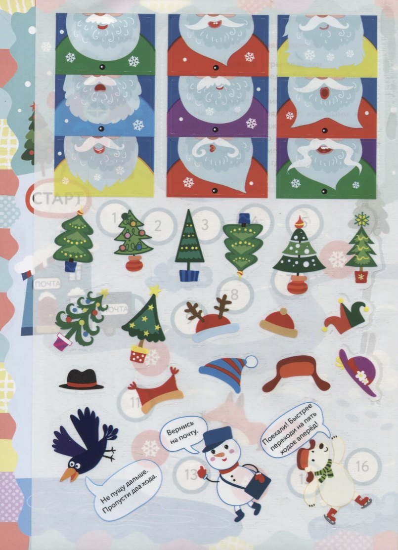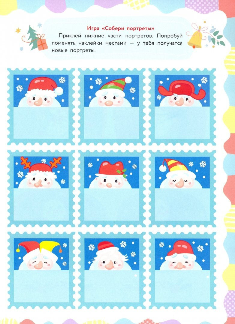 Внутри книги вас ждёт увлекательная игра "Собери портреты" с разными вариантами Деда Мороза, которую ребёнок сможет создавать, меняя наклейки местами и создавая новые забавные образы. Яркие иллюстрации и удобный формат помогут малышу с удовольствием освоить новые навыки и весело провести время в преддверии праздника.