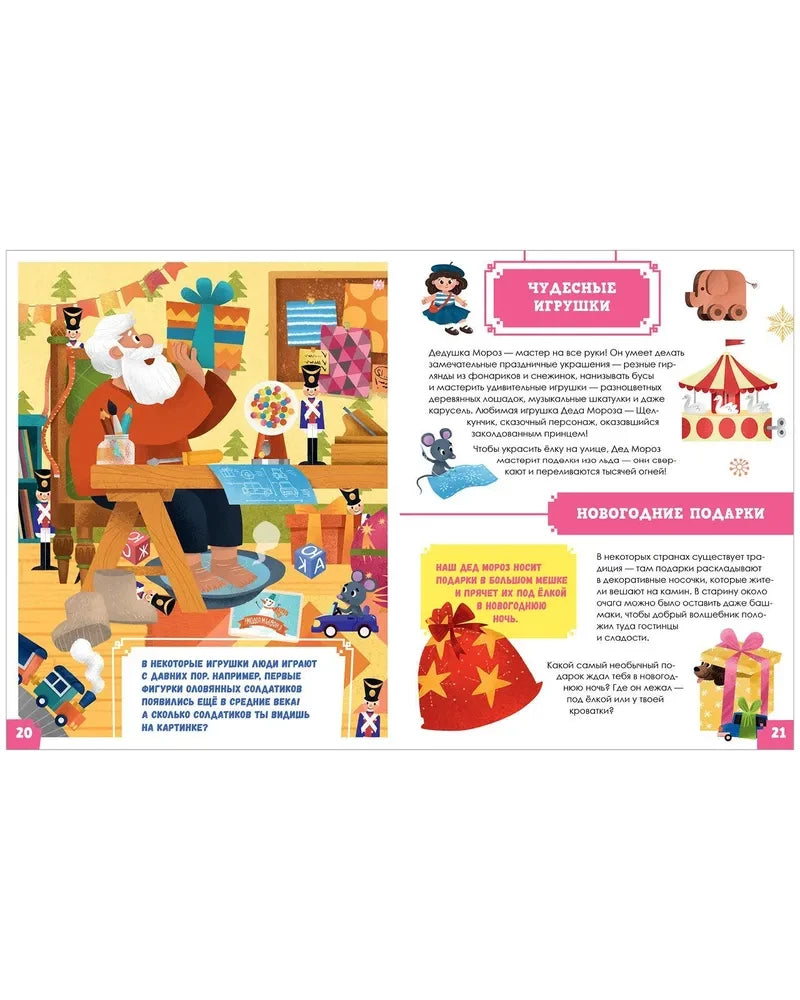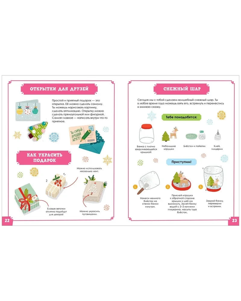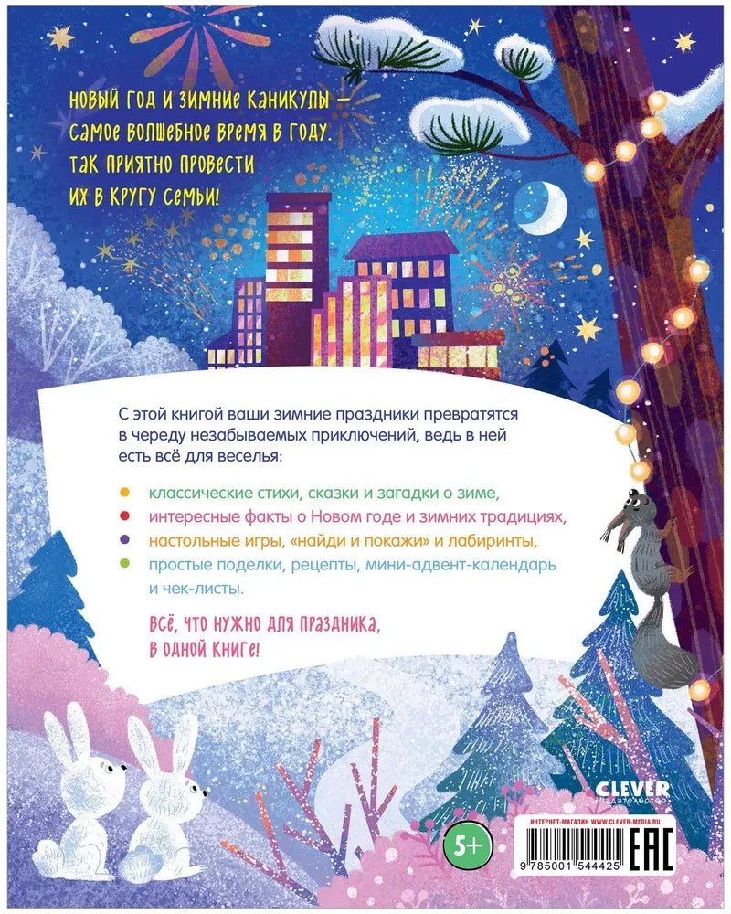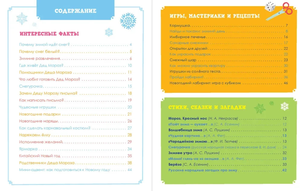Внутри вы найдете интересные стихи, сказки и загадки, которые помогут создать праздничное настроение. Особое внимание уделено творческим занятиям: игры, мастер-классы и рецепты позволят сделать своими руками новогодние открытки, снежные шары и украшения для елки.