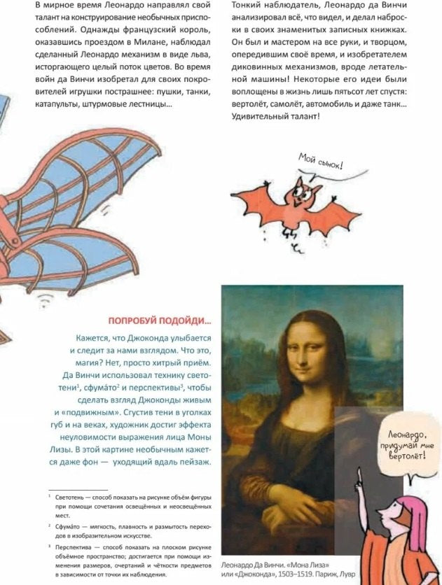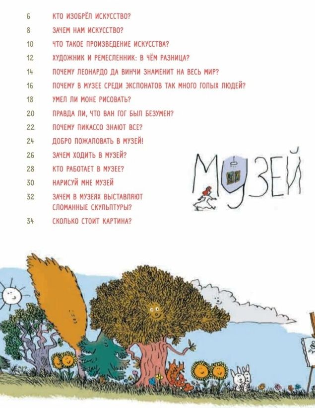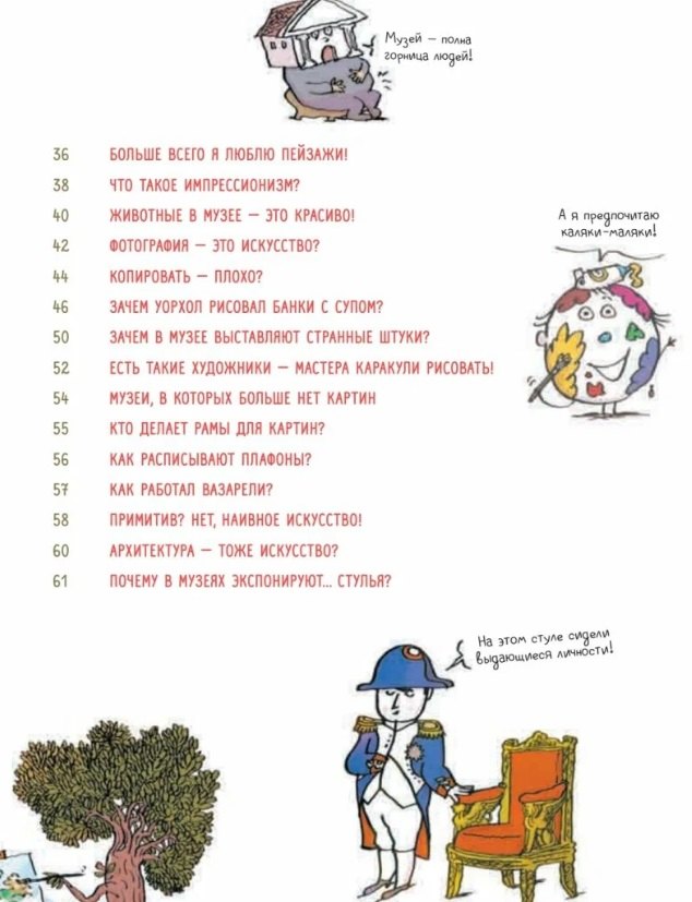 Здесь можно узнать, как появились музеи, зачем на выставках бывают необычные экспонаты, и что такое импрессионизм. Книга знакомит с известными художниками и их творчеством, раскрывает интересные истории, например, о Леонардо да Винчи и его изобретениях, а также об известных полотнах, таких как "Мона Лиза" и "Завтрак на траве" Эдуарда Мане. Всё это сопровождается яркими и смешными иллюстрациями, которые не оставят равнодушными ни детей, ни взрослых.