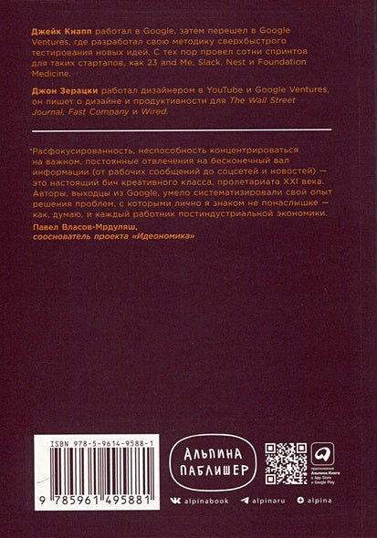 Книга раскрывает четыре ключевых урока из дизайнерского спринта и предлагает тактики для ежедневного применения: от выбора правильной точки фокусировки до адаптации системы под индивидуальные особенности. Вы научитесь контролировать энергию, восстанавливаться, а главное – выделять главное и следовать ему без перегрузок и самокритики.