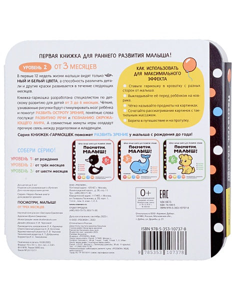 «Посмотри, малыш! Уровень 2» - это развивающая черно-белая книжка-гармошка, специально созданная для детей от трех месяцев. В первые 12 недель жизни малыши видят преимущественно черно-белые и белые цвета, а ребенок начинает постепенно различать детали и оттенки в течение следующих месяцев. Эта книжка разработана с учетом этих особенностей и способствует развитию зрения, остроты восприятия и познания окружающего мира.