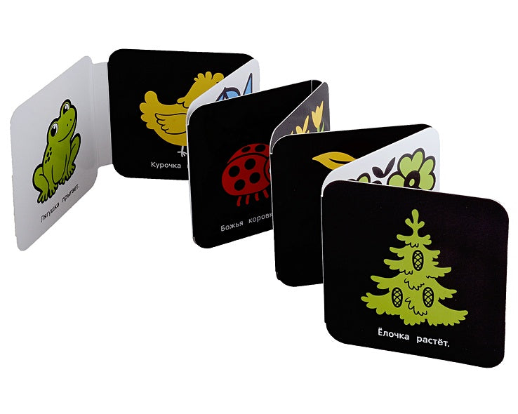 Яркие и четкие изображения с простыми узнаваемыми фигурами стимулируют зрительное внимание и помогают малышу развивать слух, речь и тактильные ощущения. Книга выполнена в удобном формате 160x160 мм и состоит из 16 страниц, которые складываются гармошкой для удобства использования и игр.