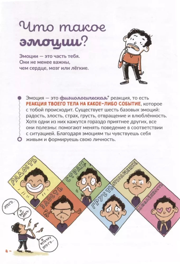 Вместе с автором читатель изучит шесть базовых эмоций, поймет их значение и научится их осознавать. Книга предлагает практические задания: изобразить разные эмоции, составить таблицу настроений на неделю, создать коллажи чувств и освоить упражнения для расслабления мышц. Это поможет ребёнку лучше понимать себя и управлять своими ощущениями.