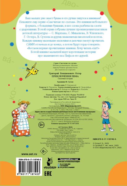 «Приключения Пифа» идеально подходят для малышей и дошкольников, которые только начинают читать. Это не просто книга, а отличный помощник для первых шагов в мир чтения и литературы. Издание выпущено издательствами АСТ и Малыш в мягком переплёте, что удобно для детских ручек и безопасно при использовании.