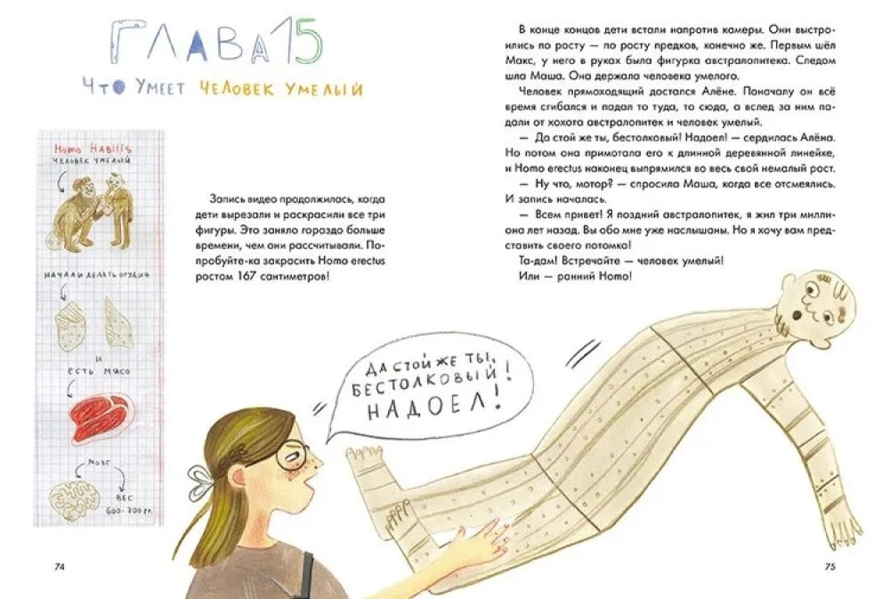 Издание оформлено ярко и необычно: текст сопровождается иллюстрациями, забавными зарисовками и заметками, которые помогут детям понять сложные темы в игровой и занимательной форме. Книга рассказывает о ключевых этапах эволюции, динозаврах, геологических слоях и первых животных, дает понятие о временах, когда происходили важные изменения на нашей планете.