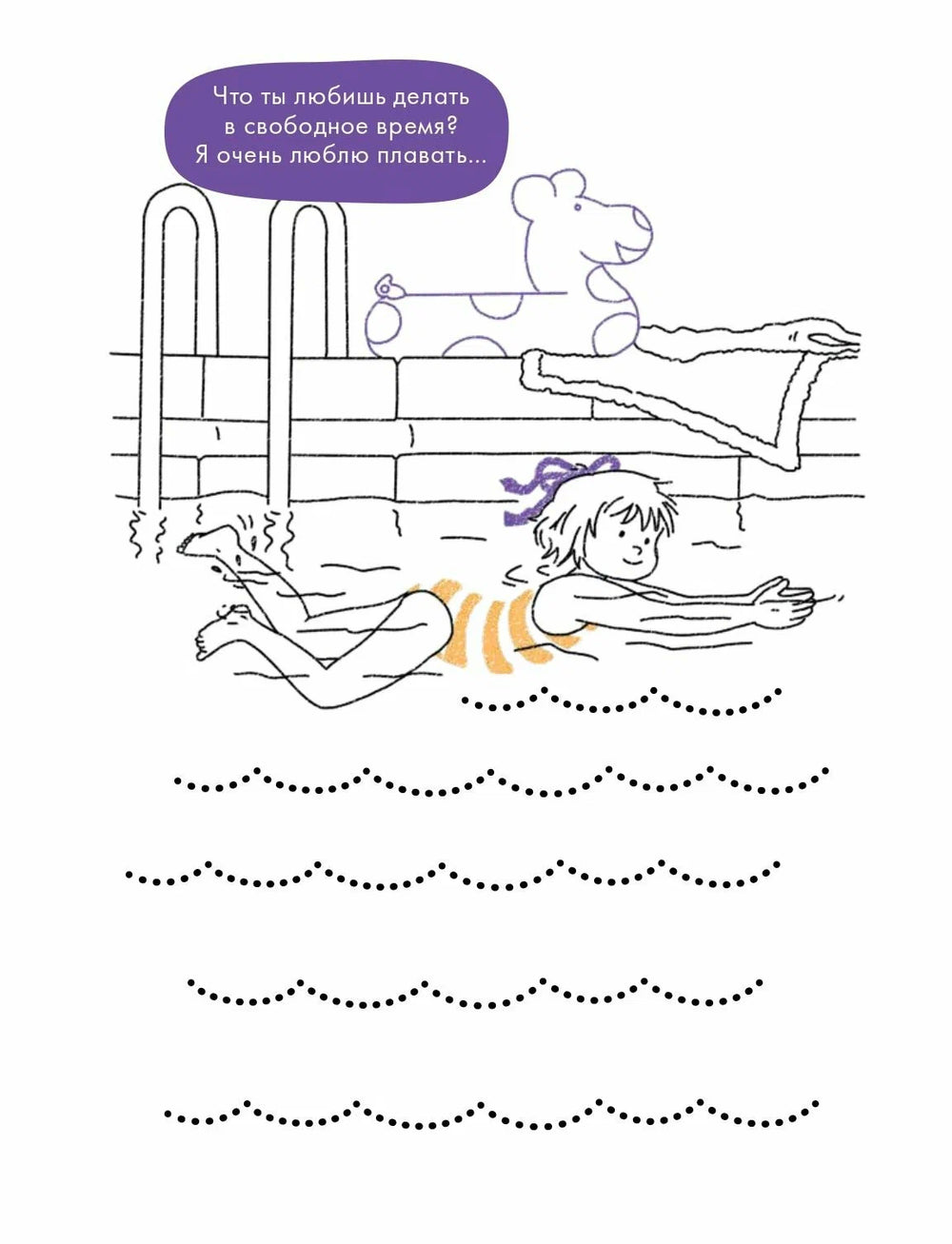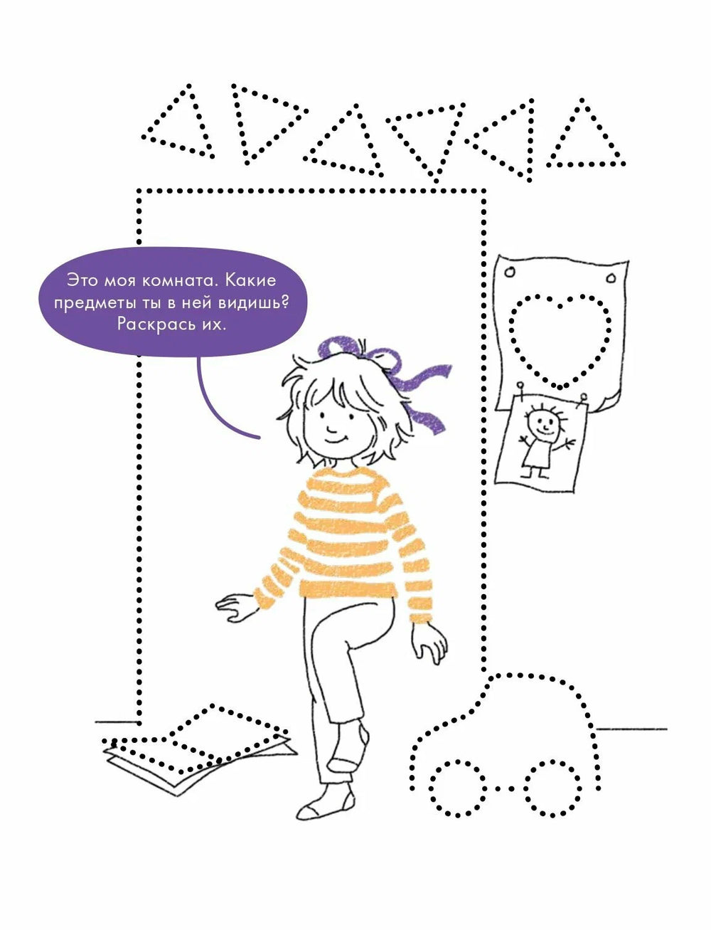 Под обложкой книги вы найдете картинки по точкам, раскраски и головоломки, которые помогают развивать речь и мелкую моторику.