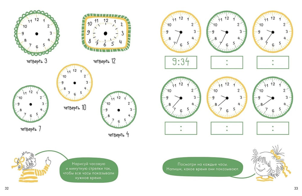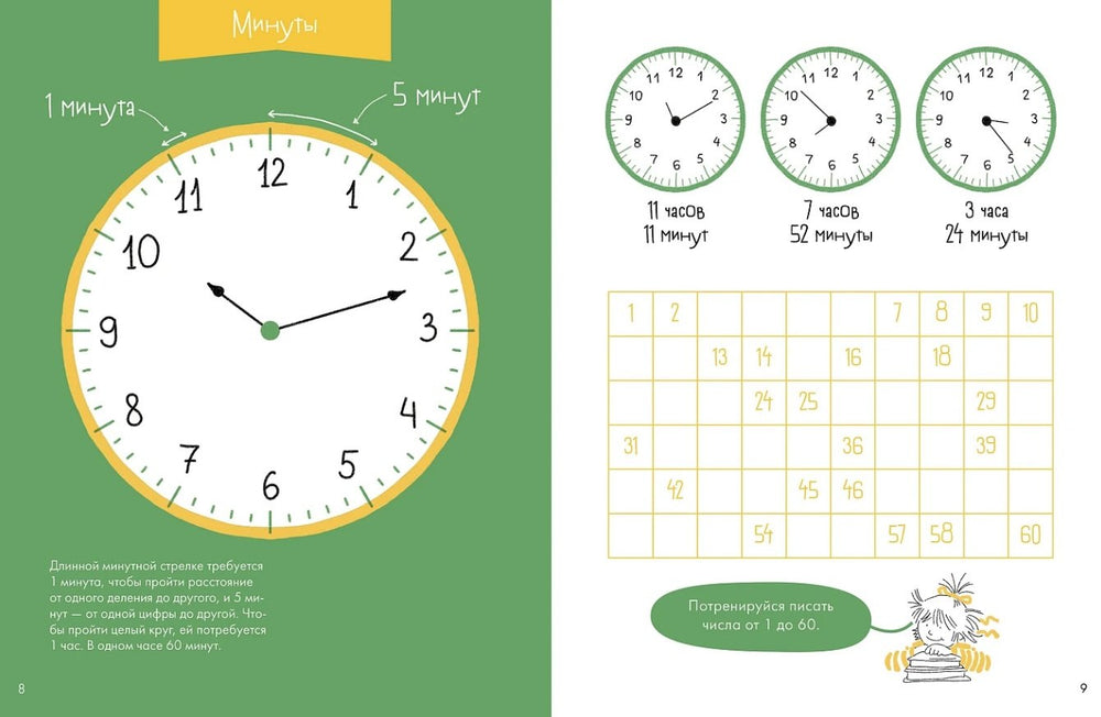 Эта развивающая тетрадь поможет детям освоить понятия минут и секунд, научит понимать и читать время на разных типах часов. В книге простыми и понятными примерами показано, сколько времени занимает движение минутной стрелки, и как считать минуты и часы. Множество иллюстраций с аналоговыми и цифровыми часами способствует быстрому усвоению материала.