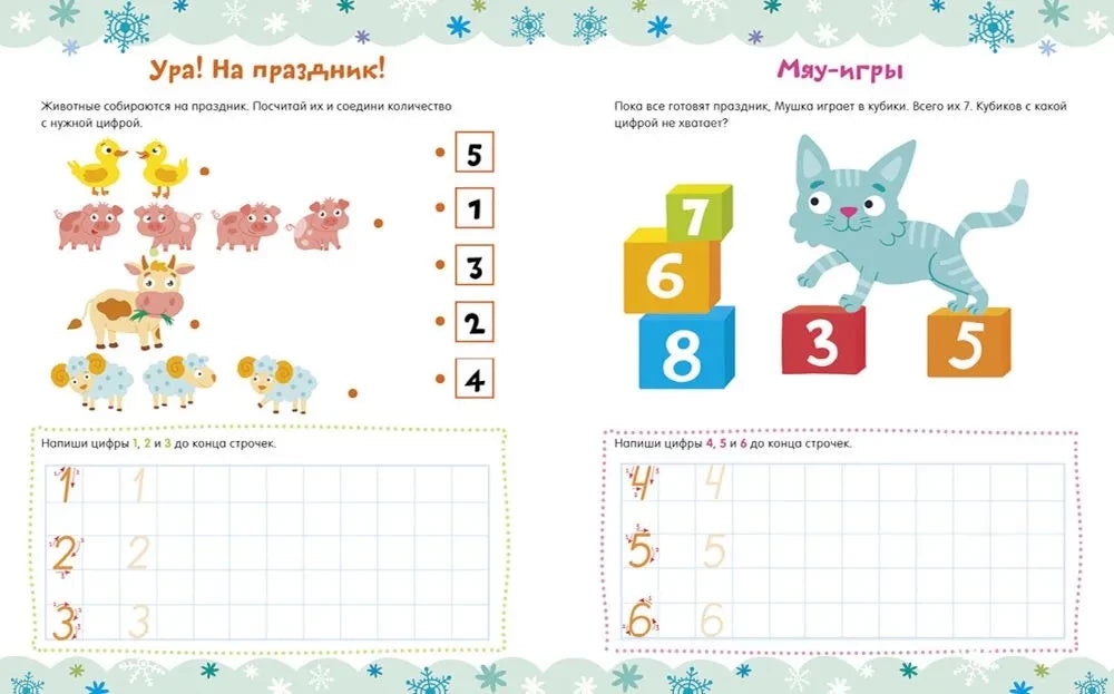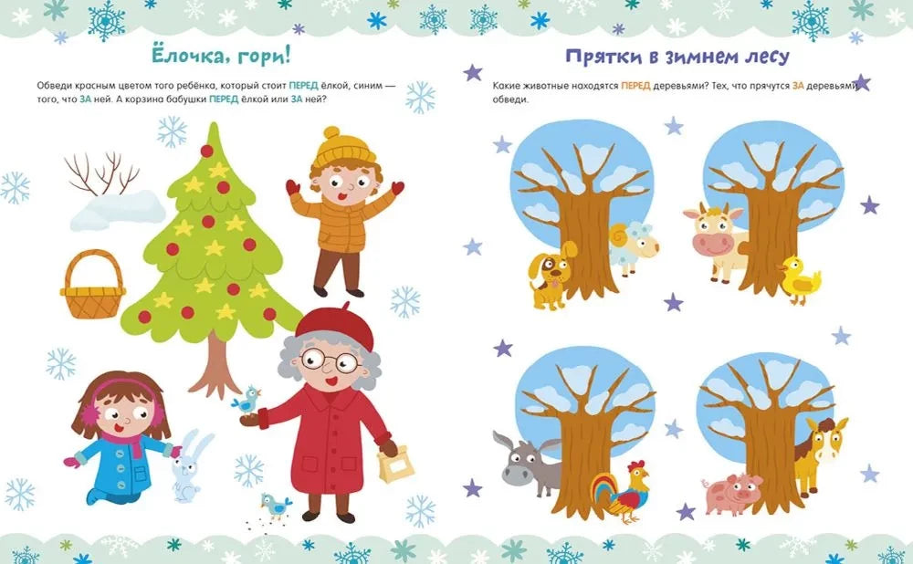 Каждая страница наполнена красочными иллюстрациями и интересными упражнениями: от подсчёта животных и написания цифр до загадок о расположении объектов и создании снежных друзей. Ребёнок сможет учиться с удовольствием, развивая пространственное мышление и умение ориентироваться в окружающем мире.