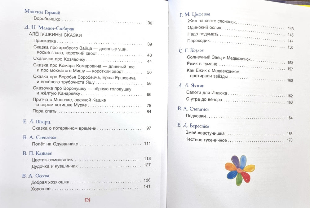 В этом издании собраны нежные и волшебные сказки известных авторов: Валентина Катаева с "Цветиком-семицветиком", Геннадия Цыферова с рассказом "Жил на свете слонёнок", Всеволода Гаршина и его "Лягушкой-путешественницей", Евгения Шварца с "Сказкой о потерянном времени", а также рассказы Сергея Козлова о ёжике в тумане и многое другое.