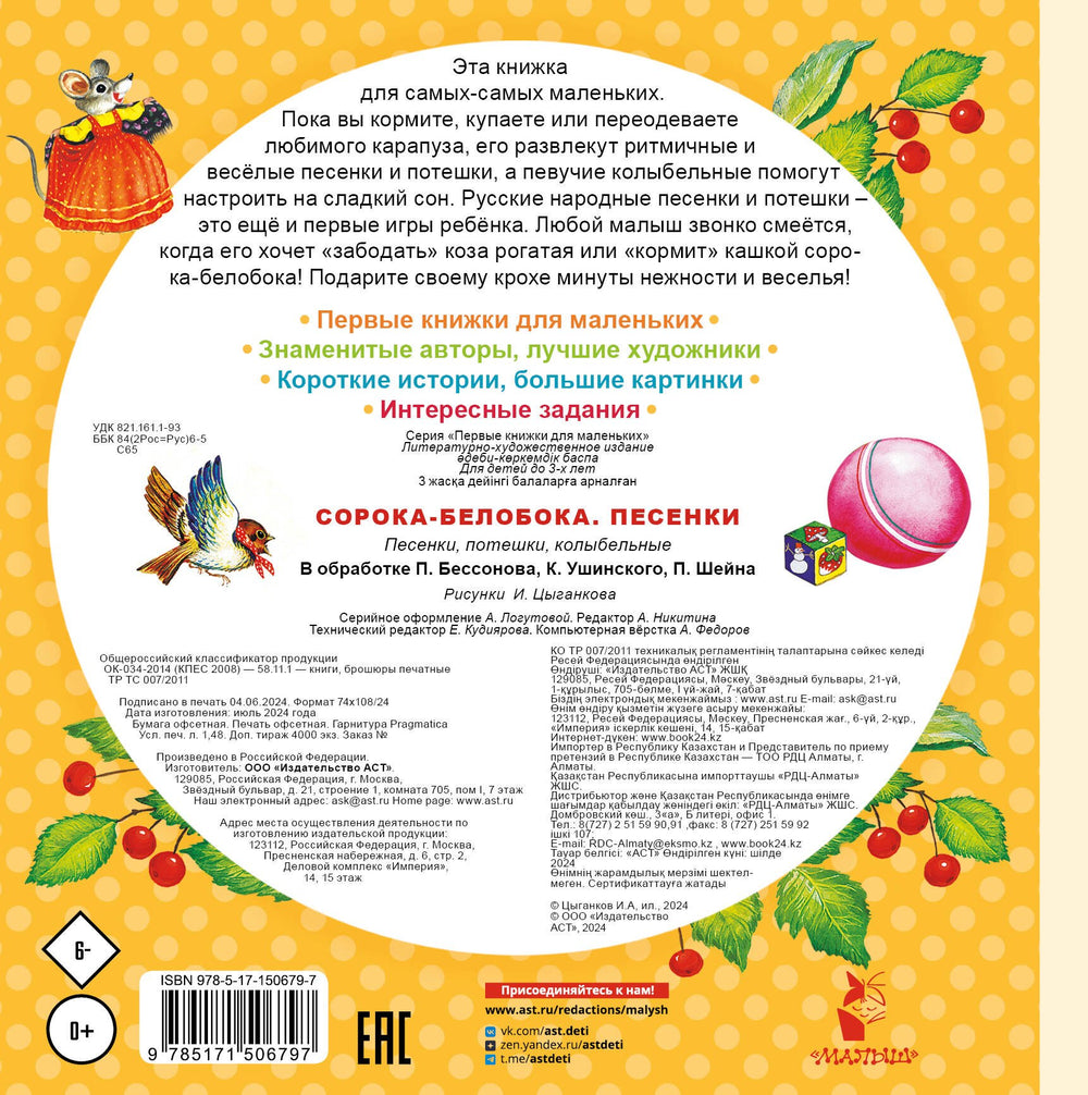 Издание сочетает в себе обучающий и развлекательный аспекты, раскрывая через музыкальные тексты простые понятия о природе и повседневной жизни. "Сорока-Белобока. Песенки" поможет родителям вовлечь ребенка в чтение и развитие, сделать это время уютным и радостным.