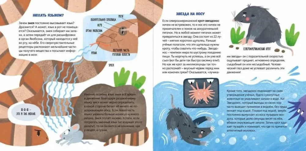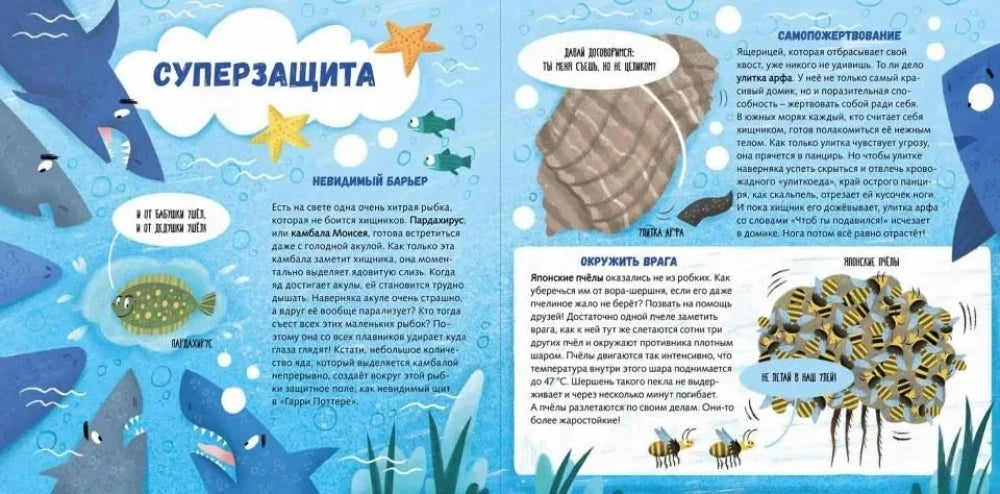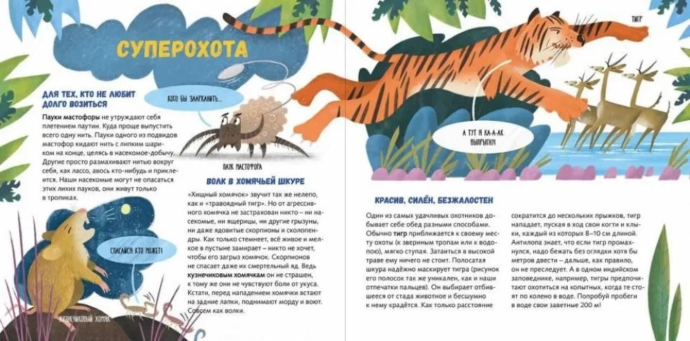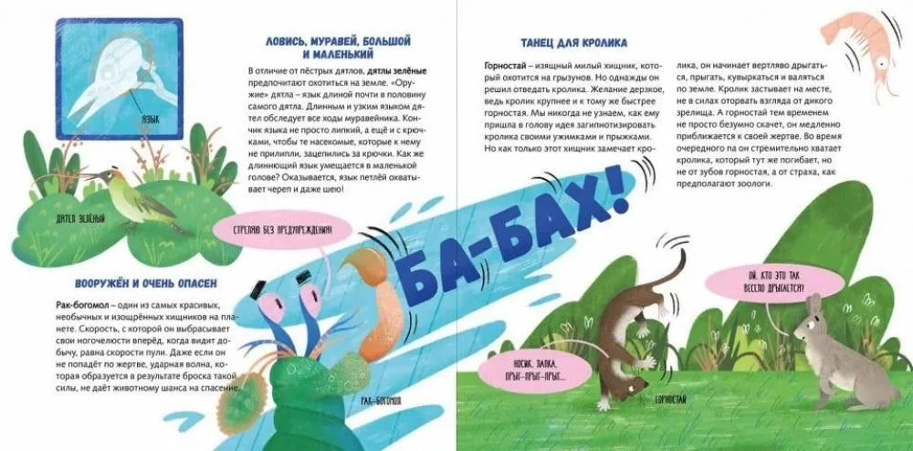 Здесь дети узнают, как зеленый дятел с помощью длинного и липкого языка ловит насекомых, какую силу и скорость показывает рак-богомол при атаке, а также что такое «мастофор» у пауков и как волк защищается своей «хомячьей шкурой». Яркие и живые иллюстрации помогут лучше представить каждое животное и понять их повадки.