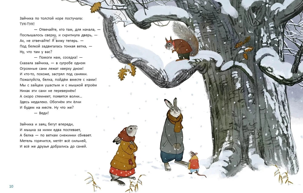Книга "Тук-тук!" Татьяны Павленко приглашает маленьких читателей в зимнюю лесную сказку, наполненную приключениями и дружбой. Главные герои - зайчик, белка и мышка - пытаются помочь другу, который застрял в огромных санях под снегом. Вместе они преодолевают метель и встречаются с лесными обитателями, такими как медведь, волки и лиса. В книгу вошли яркие, живые иллюстрации с забавными животными в теплой одежде, которые погружают в атмосферу зимнего леса и новогоднего волшебства.