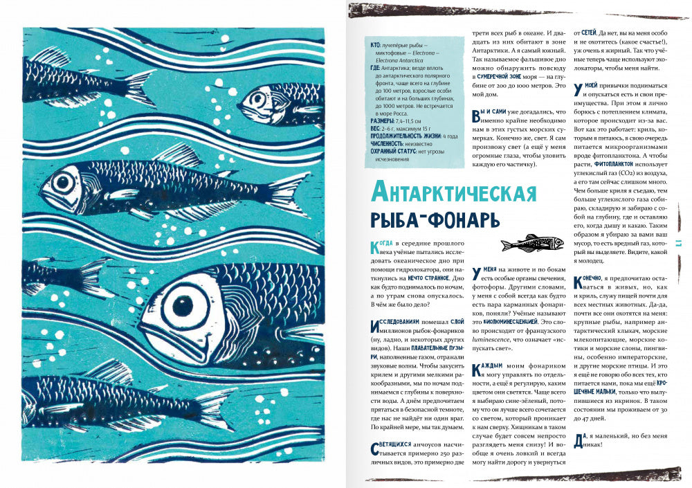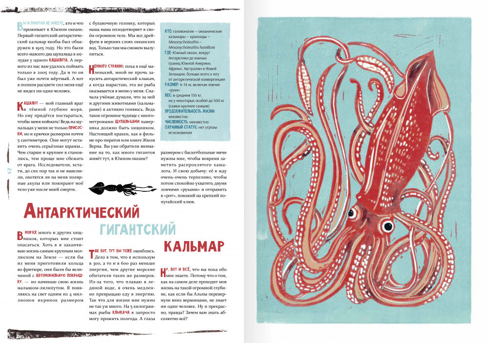 На страницах книги ярко и наглядно представлены животные, живущие в суровых условиях юга, такие как пингвины и рыба-фонарь. Иллюстрации выполнены в оригинальном стиле и помогают лучше понять особенности жизни в этом ледяном царстве.