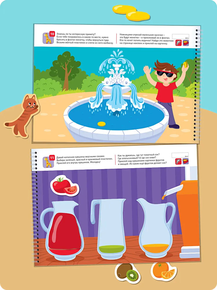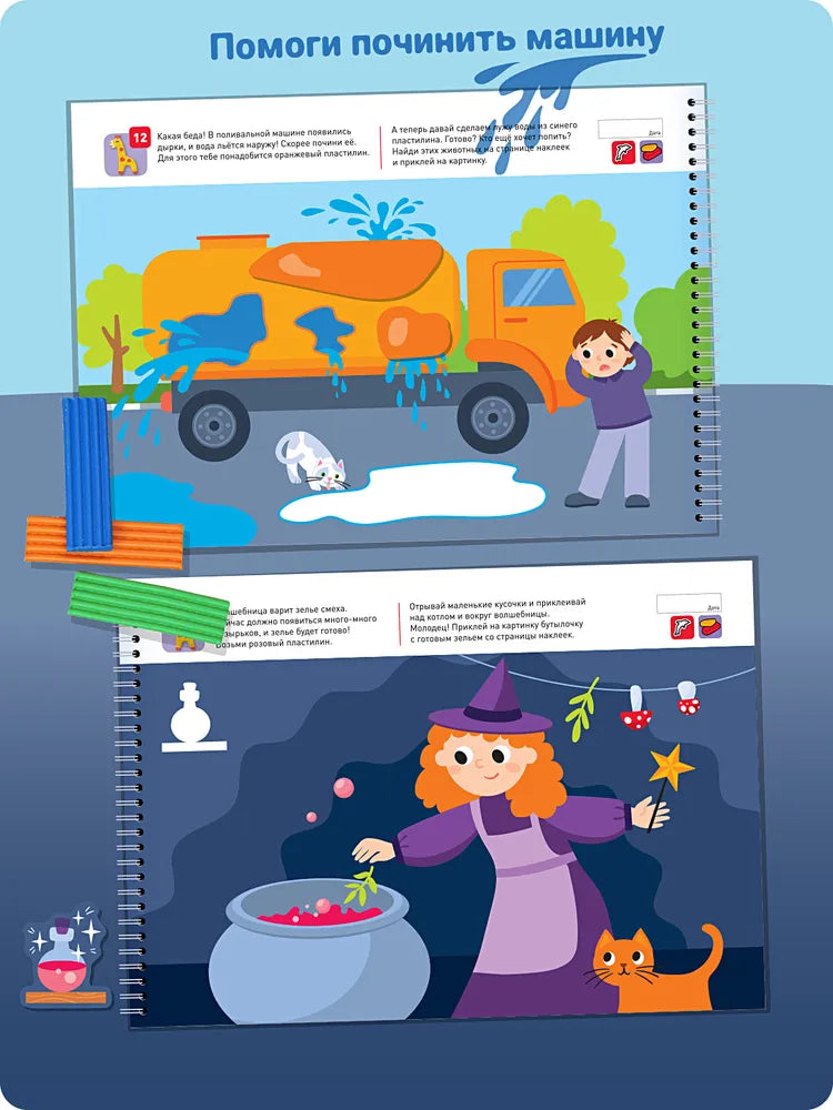 В книге есть задания с пластилином и наклейками для дополнения картинок: можно лепить фигурки, исправлять сюжеты, раскрашивать предметы и добавлять детали. Это помогает детям не только заниматься творчеством, но и учиться наблюдать, анализировать и решать задачи.
