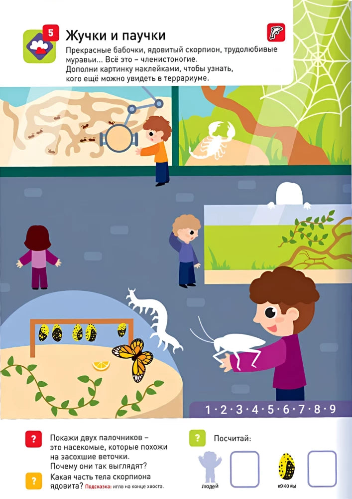 На страницах книги ребята найдут увлекательные задания, например, посчитать количество людей и коконов в террариуме, узнать особенности насекомых и пауков, а также выполнить другие развивающие упражнения. Это помогает не только изучать животных, но и развивать моторику, внимание и мышление.