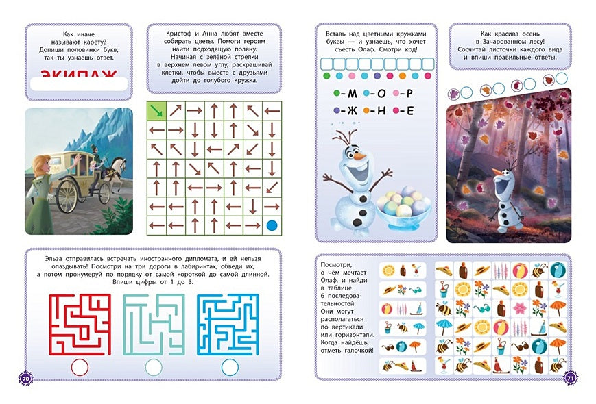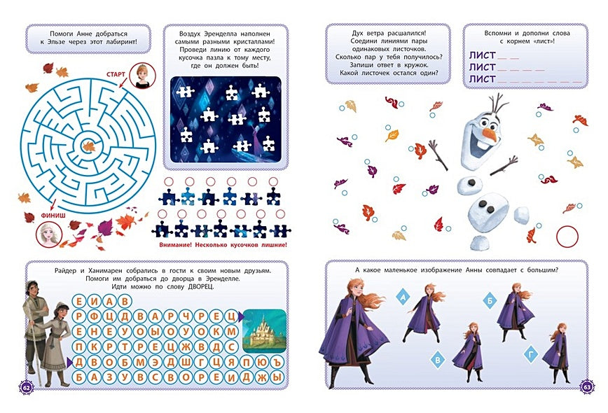 Яркие красочные иллюстрации и знакомые герои - Анна, Эльза, Кристоф, Олаф и другие - делают процесс обучения еще интереснее и помогают быстрее погрузиться в сюжет. Ребенок научится распознавать подобие, считать, дополнить слова, ориентироваться в логических задачах и искать решения, что способствует развитию мышления и памяти.