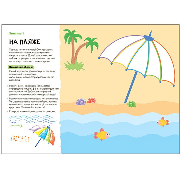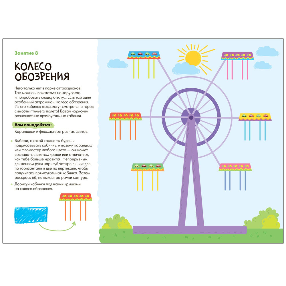 Задания разбиты на темы, соответствующие интересам малышей, например, рисование пляжа, забавного котёнка, цветных леденцов, чашки с узором и даже колеса обозрения с разноцветными кабинками. Каждый урок направлен на формирование умения удерживать карандаш, проводить ровные линии и развивать воображение.