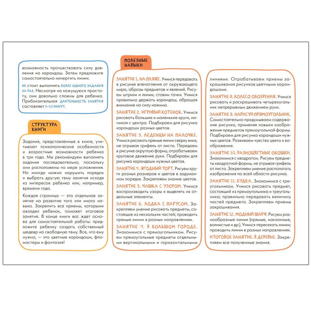 Серия создана для детей от трёх лет и предлагает простой и понятный подход к развитию творческих навыков. Каждое занятие легко выполняется ребёнком и включает последовательные шаги: от простых линий и кругов до создания целых рисунков с цветными карандашами и фломастерами.
