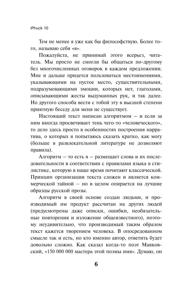 Это произведение для тех, кто не боится философских вопросов, кто готов воспринимать нестандартные идеи и исследовать грани человеческого и искусственного. "iPhuck 10" – книга, которая заставляет задуматься о будущем, о природе интеллекта и воле к жизни, от которой зависит судьба искусства и общества.