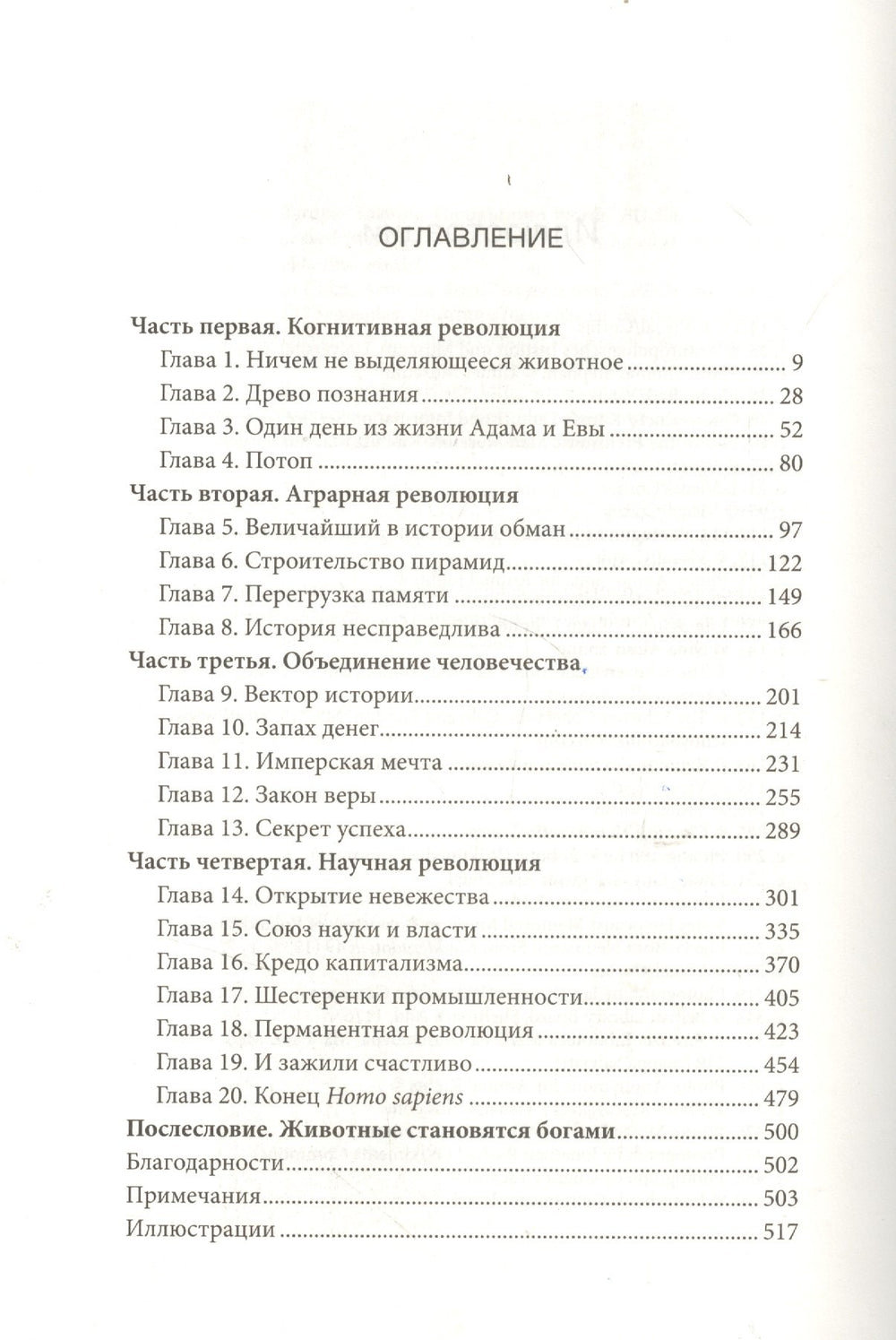 Произведение разделено на четыре части, каждая из которых освещает ключевые этапы развития человечества: когнитивную, аграрную, объединение людей и научную революцию. Через яркие главы, такие как "Ничем не выделяющееся животное", "Величайший в истории обман", "Имперская мечта" и "Кредо капитализма", читатель погружается в сложные процессы, повлиявшие на формирование современного общества.